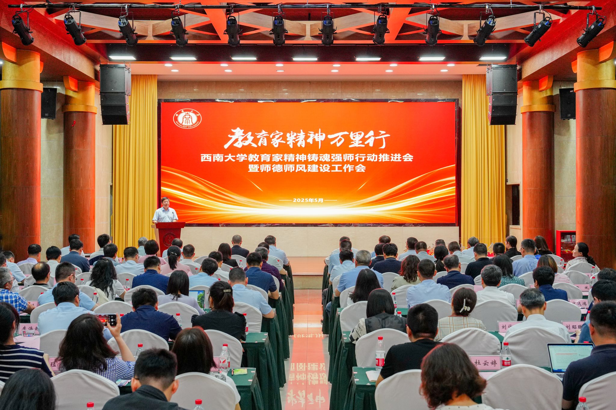 为深入贯彻习近平总书记关于教育的重要论述及全国教育大会精神,积极响应《教育部办公厅关于开展“教育家精神万里行”活动的通知》,5月19日,学校在东方红会议厅举行教育家精神铸魂强师行动推进会暨师德师风建设工作会。党委书记张卫国、校长王进军以及相关校领导出席,学校教师工作委员会成员单位负责人、各二级党组织负责人以及师生代表参会。副校长邹芙都主持会议。