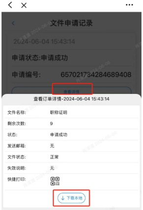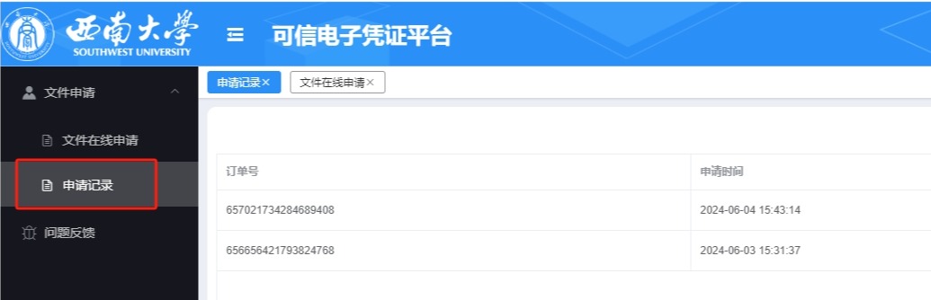 点击左侧导航栏“申请记录”选项卡,可查询文件的申请状态及订单详情,点击“查看详情”可以再次下载此证明文件。