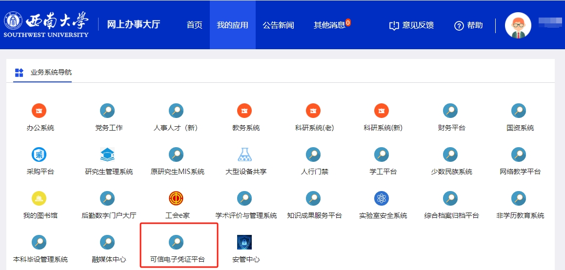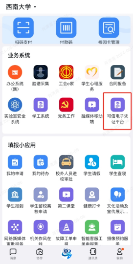 手机端通过数智西大(钉钉)访问(仅限校园网)。打开数智西大(钉钉)app,点击下方中间“工作台”,找到【可信电子凭证平台】进入。