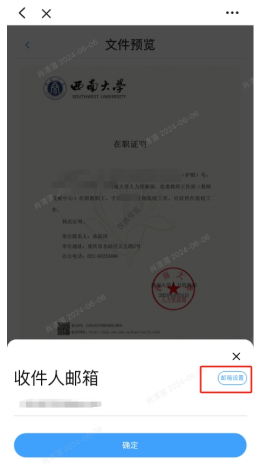 2.确认无误后需要选择【下载PDF】或【发送邮箱】两种接收方式。点击【发送邮箱】按钮,填写收件人邮箱,也可以点击【邮箱设置】添加默认邮箱。