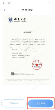 2.点击需要的文件后会生成预览图,温馨提示:预览图无法作为可信电子文件。确认无误后,需要选择【下载PDF】或【发送邮箱】两种接收方式。