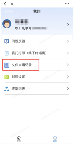 点击“我的”,进入个人信息界面,点击“文件申请记录”即可查看申请记录,点击“查看详情”可以再次下载此证明文件。